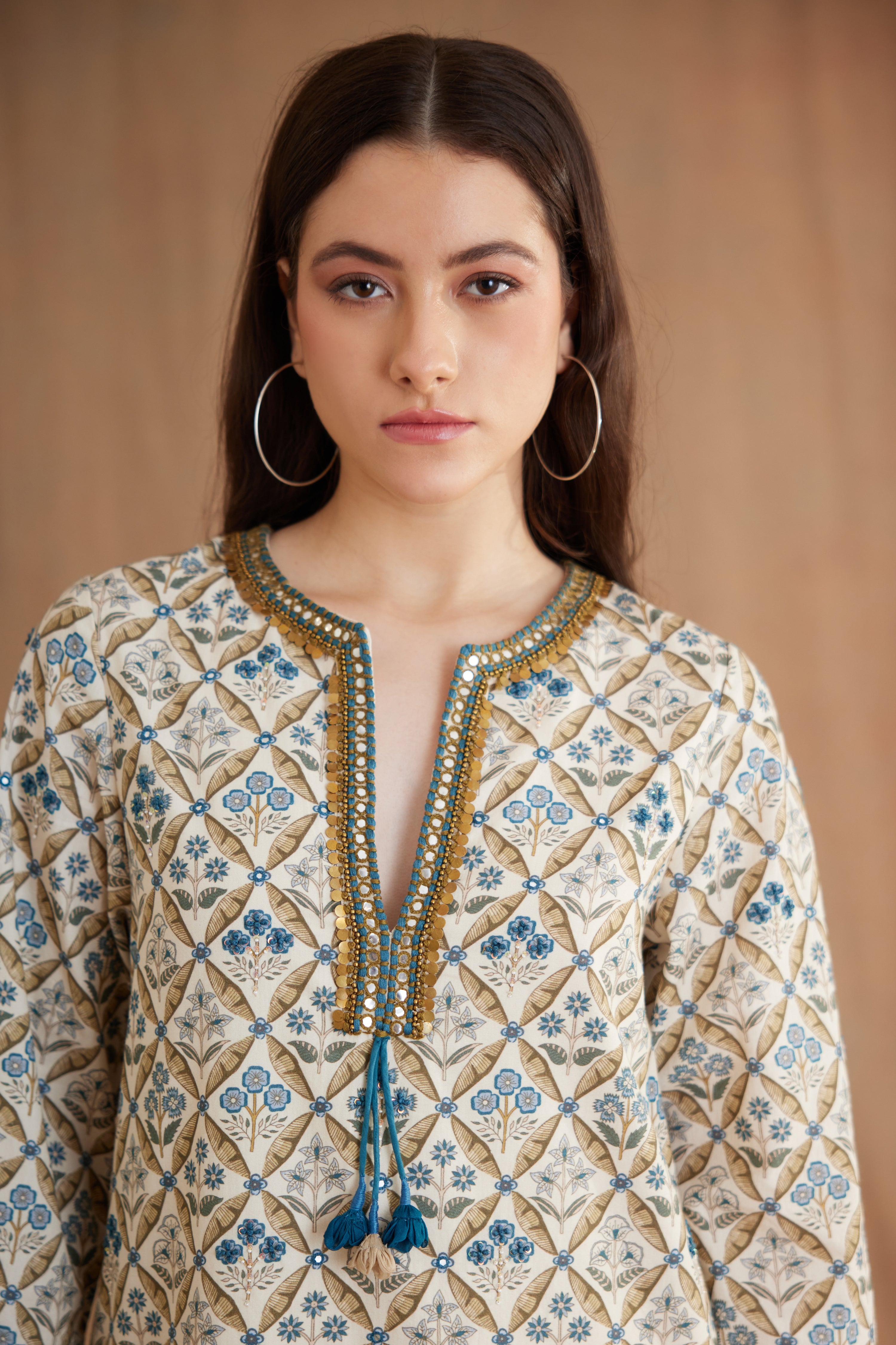 Featuring Bespoke Mughal Print Tunic In 100% Cotton Poplin With Antique Brass Sequins And Mirror Embroideries Details On The Neckline, Sleeves And Stitch Details At The Bottom. It Is Paired With A Matching Tailored Pants.