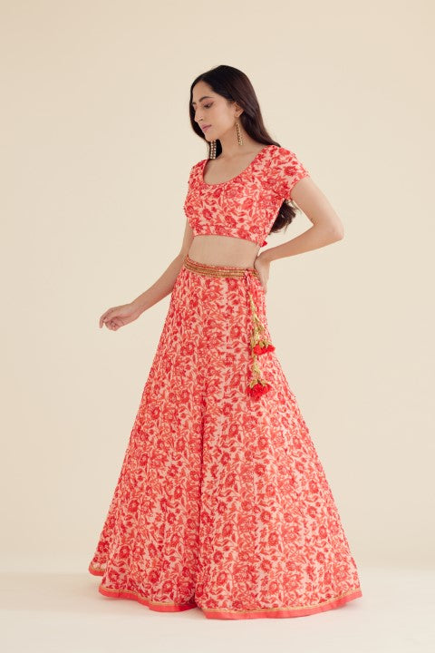 Coral Red Printed Lehenga Set