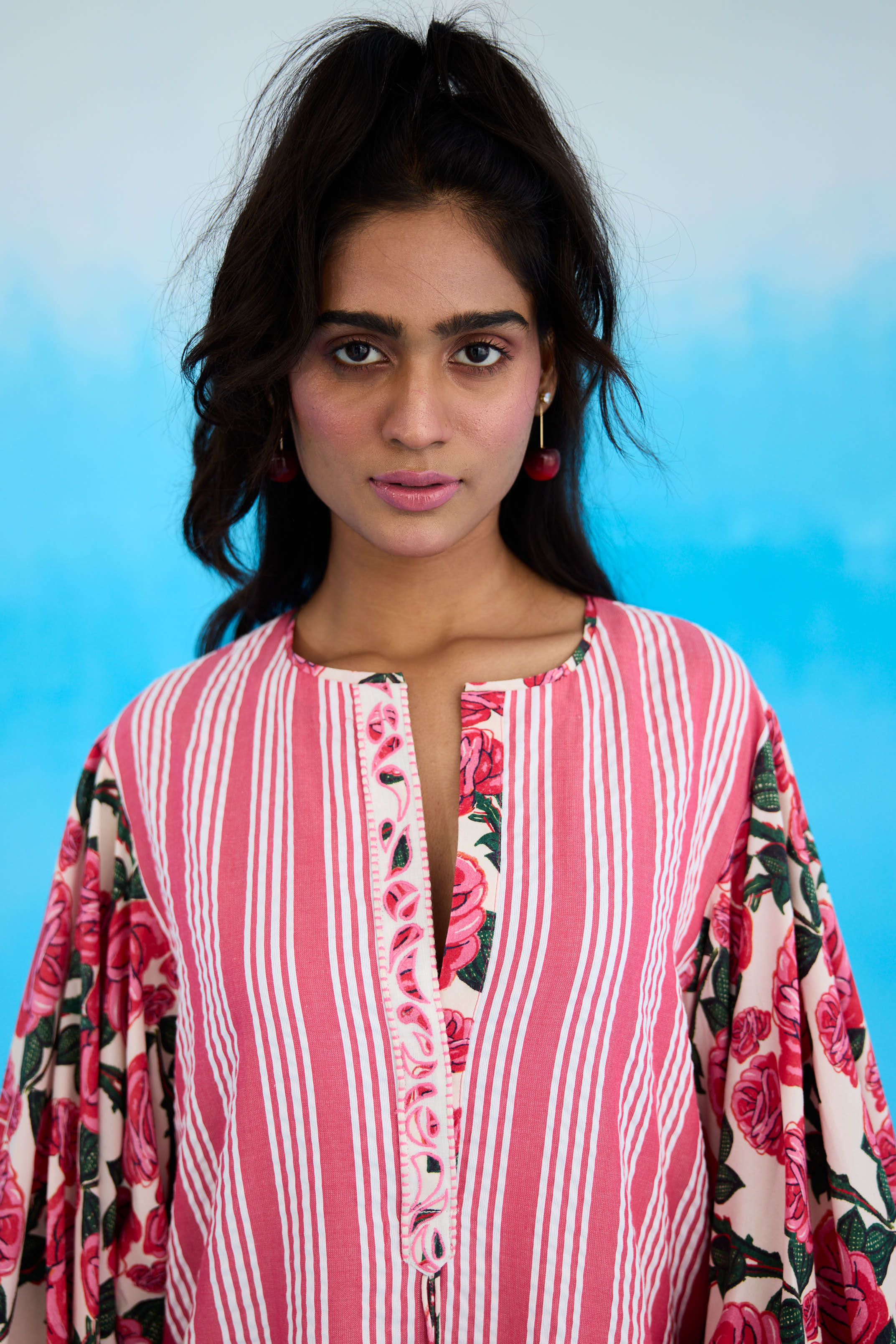 Pink A-Line dress with side slit and vintage rose printed balloon sleeves with handmade flower tassels detailing in 100% handwoven seersucker cotton.