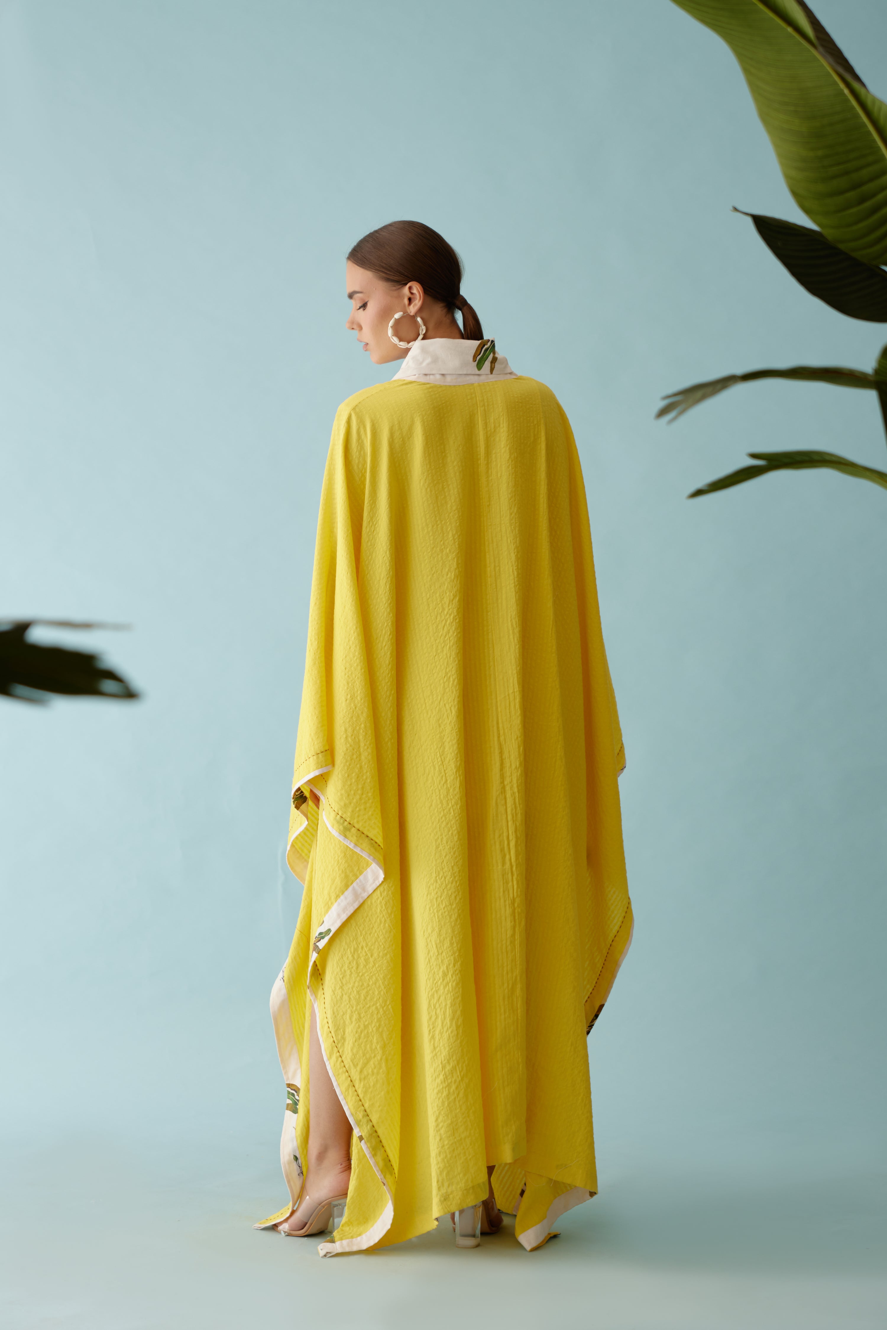 Yellow kimono sleeves overgarment with hand-painted banana tree print details and hand-stitched detail in 100% handwoven seersucker cotton.
