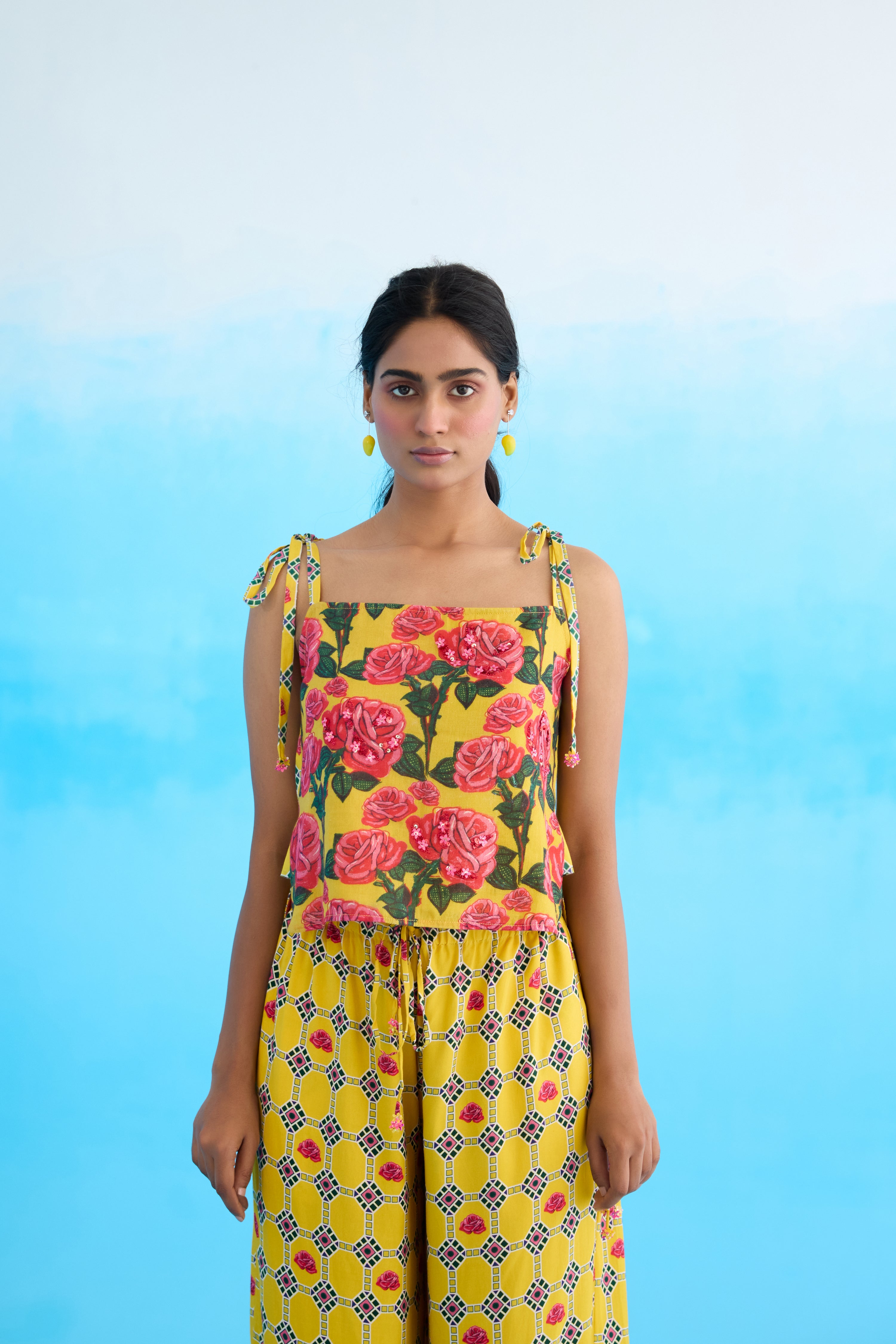 Yellow vintage rose hi-low strappy top with beads and sequins embroidery detail in 100% cotton.